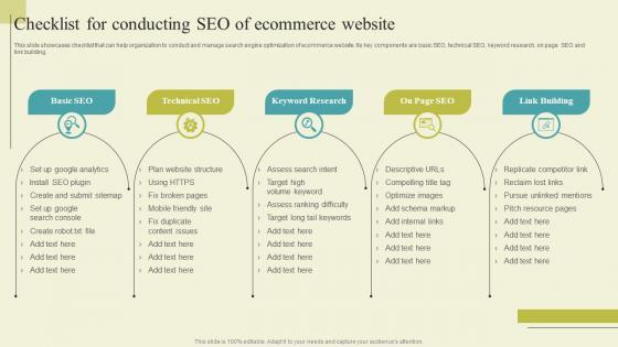 This slide showcases checklist that can help organization to conduct and manage search engine optimization of ecommerce website. Its key components are basic SEO, technical SEO, keyword research, on page SEO and link building. Whether you have daily or monthly meetings, a brilliant presentation is necessary. Successful Guide For Ecommerce Promotion Checklist For Conducting Seo Of Inspiration Pdf can be your best option for delivering a presentation. Represent everything in detail using Successful Guide For Ecommerce Promotion Checklist For Conducting Seo Of Inspiration Pdf and make yourself stand out in meetings. The template is versatile and follows a structure that will cater to your requirements. All the templates prepared by Slidegeeks are easy to download and edit. Our research experts have taken care of the corporate themes as well. So, give it a try and see the results. This slide showcases checklist that can help organization to conduct and manage search engine optimization of ecommerce website. Its key components are basic SEO, technical SEO, keyword research, on page SEO and link building.