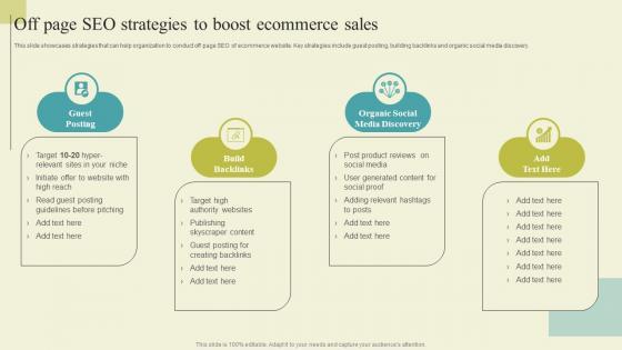 This slide showcases strategies that can help organization to conduct off page SEO of ecommerce website. Key strategies include guest posting, building backlinks and organic social media discovery. Slidegeeks has constructed Successful Guide For Ecommerce Promotion Off Page Seo Strategies To Boost Brochure Pdf after conducting extensive research and examination. These presentation templates are constantly being generated and modified based on user preferences and critiques from editors. Here, you will find the most attractive templates for a range of purposes while taking into account ratings and remarks from users regarding the content. This is an excellent jumping-off point to explore our content and will give new users an insight into our top-notch PowerPoint Templates. This slide showcases strategies that can help organization to conduct off page SEO of ecommerce website. Key strategies include guest posting, building backlinks and organic social media discovery.