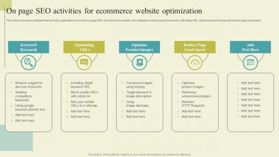 This slide showcases strategies that can help organization to conduct on page SEO of ecommerce website. Key strategies include keyword research, optimizing URL, optimize product image and reduce page load speed. Presenting this PowerPoint presentation, titled Successful Guide For Ecommerce Promotion On Page Seo Activities For Ecommerce Elements Pdf, with topics curated by our researchers after extensive research. This editable presentation is available for immediate download and provides attractive features when used. Download now and captivate your audience. Presenting this Successful Guide For Ecommerce Promotion On Page Seo Activities For Ecommerce Elements Pdf. Our researchers have carefully researched and created these slides with all aspects taken into consideration. This is a completely customizable Successful Guide For Ecommerce Promotion On Page Seo Activities For Ecommerce Elements Pdf that is available for immediate downloading. Download now and make an impact on your audience. Highlight the attractive features available with our PPTs. This slide showcases strategies that can help organization to conduct on page SEO of ecommerce website. Key strategies include keyword research, optimizing URL, optimize product image and reduce page load speed.
