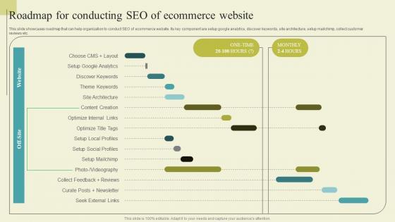 This slide showcases roadmap that can help organization to conduct SEO of ecommerce website. Its key component are setup google analytics, discover keywords, site architecture, setup mailchimp, collect customer reviews etc. Slidegeeks is one of the best resources for PowerPoint templates. You can download easily and regulate Successful Guide For Ecommerce Promotion Roadmap For Conducting Seo Of Demonstration Pdf for your personal presentations from our wonderful collection. A few clicks is all it takes to discover and get the most relevant and appropriate templates. Use our Templates to add a unique zing and appeal to your presentation and meetings. All the slides are easy to edit and you can use them even for advertisement purposes. This slide showcases roadmap that can help organization to conduct SEO of ecommerce website. Its key component are setup google analytics, discover keywords, site architecture, setup mailchimp, collect customer reviews etc.