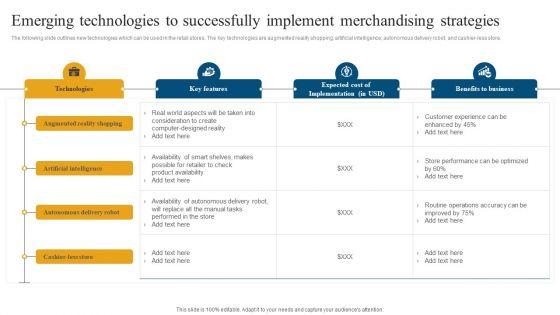 The following slide outlines new technologies which can be used in the retail stores. The key technologies are augmented reality shopping artificial intelligence autonomous delivery robot and cashier-less store.Are you in need of a template that can accommodate all of your creative concepts This one is crafted professionally and can be altered to fit any style. Use it with Google Slides or PowerPoint. Include striking photographs, symbols, depictions, and other visuals. Fill, move around, or remove text boxes as desired. Test out color palettes and font mixtures. Edit and save your work, or work with colleagues. Download Emerging Technologies To Successfully Implement Merchandising Strategies Retail Merchandising Techniques Pictures PDF and observe how to make your presentation outstanding. Give an impeccable presentation to your group and make your presentation unforgettable.