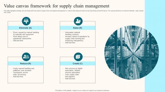 This slide highlights strategy canvas framework to be used in supply chain and logistics management in order to take steps and improve its productivity and performance. The various elements covered are eliminate, raise, reduce and create. Pitch your topic with ease and precision using this Value Canvas Framework For Supply Chain Management Clipart Pdf. This layout presents information on Value Canvas Framework, Supply Chain Management, Productivity And Performance. It is also available for immediate download and adjustment. So, changes can be made in the color, design, graphics or any other component to create a unique layout. This slide highlights strategy canvas framework to be used in supply chain and logistics management in order to take steps and improve its productivity and performance. The various elements covered are eliminate, raise, reduce and create.