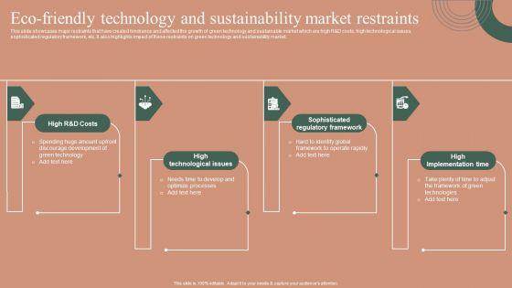 This slide showcases major restraints that have created hindrance and affected the growth of green technology and sustainable market which are high R and D costs, high technological issues, sophisticated regulatory framework, etc. It also highlights impact of these restraints on green technology and sustainability market. Present like a pro with Eco Friendly Technology And Sustainability Market Restraints Icons PDF Create beautiful presentations together with your team, using our easy-to-use presentation slides. Share your ideas in real-time and make changes on the fly by downloading our templates. So whether you are in the office, on the go, or in a remote location, you can stay in sync with your team and present your ideas with confidence. With Slidegeeks presentation got a whole lot easier. Grab these presentations today.