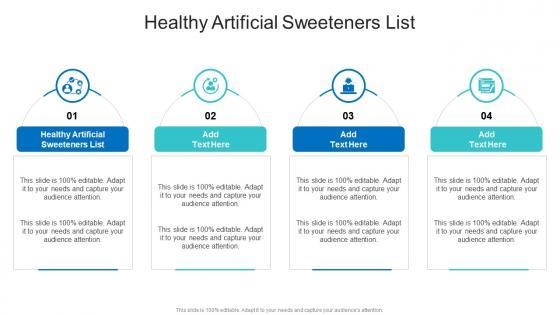Presenting our innovatively designed set of slides titled Healthy Artificial Sweeteners List In Powerpoint And Google Slides Cpb. This completely editable PowerPoint graphic exhibits Healthy Artificial Sweeteners List that will help you convey the message impactfully. It can be accessed with Google Slides and is available in both standard screen and widescreen aspect ratios. Apart from this, you can download this well structured PowerPoint template design in different formats like PDF, JPG, and PNG. So, click the download button now to gain full access to this PPT design. Our Healthy Artificial Sweeteners List In Powerpoint And Google Slides Cpb are topically designed to provide an attractive backdrop to any subject. Use them to look like a presentation pro.