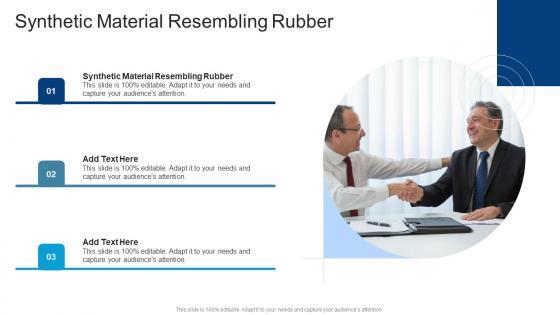 Introducing our well designed Synthetic Material Resembling Rubber In Powerpoint And Google Slides Cpb. This PowerPoint design presents information on topics like Synthetic Material Resembling Rubber. As it is predesigned it helps boost your confidence level. It also makes you a better presenter because of its high quality content and graphics. This PPT layout can be downloaded and used in different formats like PDF, PNG, and JPG. Not only this, it is available in both Standard Screen and Widescreen aspect ratios for your convenience. Therefore, click on the download button now to persuade and impress your audience. Our Synthetic Material Resembling Rubber In Powerpoint And Google Slides Cpb are topically designed to provide an attractive backdrop to any subject. Use them to look like a presentation pro.