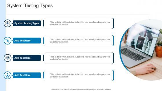 Introducing our well-designed System Testing Types In Powerpoint And Google Slides Cpb. This PowerPoint design presents information on topics like System Testing Types. As it is predesigned it helps boost your confidence level. It also makes you a better presenter because of its high-quality content and graphics. This PPT layout can be downloaded and used in different formats like PDF, PNG, and JPG. Not only this, it is available in both Standard Screen and Widescreen aspect ratios for your convenience. Therefore, click on the download button now to persuade and impress your audience. Our System Testing Types In Powerpoint And Google Slides Cpb are topically designed to provide an attractive backdrop to any subject. Use them to look like a presentation pro.