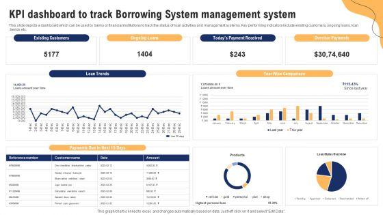 This slide depicts a dashboard which can be used by banks or financial institutions to track the status of loan activities and management systems. Key performing indicators include existing customers, ongoing loans, loan trends etc. Showcasing this set of slides titled KPI Dashboard To Track Borrowing System Management System Ppt Visual Aids Portfolio PDF. The topics addressed in these templates are Existing Customers, Ongoing Loans, Todays Payment Received. All the content presented in this PPT design is completely editable. Download it and make adjustments in color, background, font etc. as per your unique business setting.