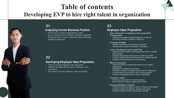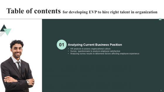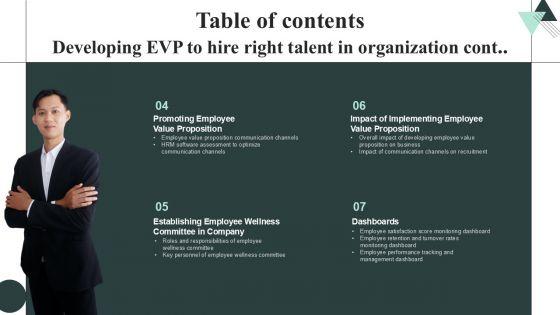 Want to ace your presentation in front of a live audience Our Table Of Contents Developing EVP To Hire Right Talent In Organization Inspiration PDF can help you do that by engaging all the users towards you. Slidegeeks experts have put their efforts and expertise into creating these impeccable powerpoint presentations so that you can communicate your ideas clearly. Moreover, all the templates are customizable, and easy to edit and downloadable. Use these for both personal and commercial use.