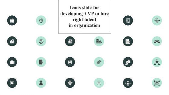 Introducing our well designed Icons Slide For Developing EVP To Hire Right Talent In Organization Ideas PDF set of slides. The slide displays editable icons to enhance your visual presentation. The icons can be edited easily. So customize according to your business to achieve a creative edge. Download and share it with your audience.