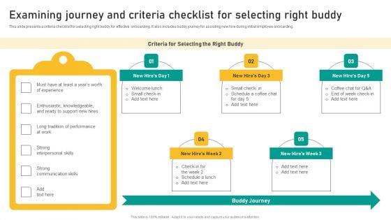 This slide presents a criteria checklist for selecting right buddy for effective onboarding. It also includes buddy journey for assisting new hire during initial employee onboarding. Want to ace your presentation in front of a live audience Our Talent Retention Initiatives For New Hire Onboarding Examining Journey And Criteria Checklist Topics PDF can help you do that by engaging all the users towards you. Slidegeeks experts have put their efforts and expertise into creating these impeccable powerpoint presentations so that you can communicate your ideas clearly. Moreover, all the templates are customizable, and easy to edit and downloadable. Use these for both personal and commercial use.
