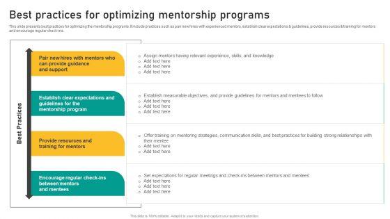 This slide presents best practices for optimizing the mentorship programs. It include practices such as pair new hires with experienced mentors, establish clear expectations and guidelines, provide resources and training for mentors and encourage regular check-ins. If you are looking for a format to display your unique thoughts, then the professionally designed Talent Retention Initiatives For New Hire Onboarding Best Practices For Optimizing Mentorship Topics PDF is the one for you. You can use it as a Google Slides template or a PowerPoint template. Incorporate impressive visuals, symbols, images, and other charts. Modify or reorganize the text boxes as you desire. Experiment with shade schemes and font pairings. Alter, share or cooperate with other people on your work. Download Talent Retention Initiatives For New Hire Onboarding Best Practices For Optimizing Mentorship Topics PDF and find out how to give a successful presentation. Present a perfect display to your team and make your presentation unforgettable.