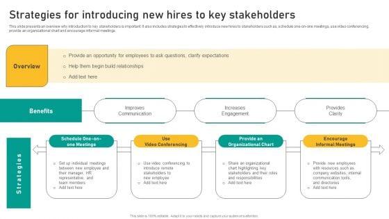 This slide presents an overview why introduction to key stakeholders is important. It also includes strategies to effectively introduce new hires to stakeholders such as, schedule one-on-one meetings, use video conferencing, provide an organizational chart and encourage informal meetings. Are you searching for a Talent Retention Initiatives For New Hire Onboarding Strategies For Introducing New Hires Topics PDF that is uncluttered, straightforward, and original Its easy to edit, and you can change the colors to suit your personal or business branding. For a presentation that expresses how much effort you have put in, this template is ideal. With all of its features, including tables, diagrams, statistics, and lists, its perfect for a business plan presentation. Make your ideas more appealing with these professional slides. Download Talent Retention Initiatives For New Hire Onboarding Strategies For Introducing New Hires Topics PDF from Slidegeeks today.