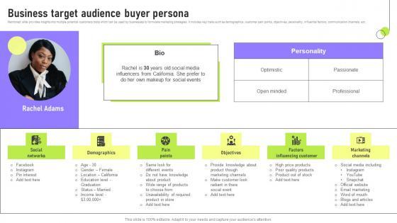 Mentioned slide provides insights into multiple potential customers traits which can be used by businesses to formulate marketing strategies. It includes key traits such as demographics, customer pain points, objectives, personality, influential factors, communication channels, etc. Create an editable Business Target Audience Buyer Deployment Of Marketing Communication Pictures Pdf that communicates your idea and engages your audience. Whether you are presenting a business or an educational presentation, pre designed presentation templates help save time. Business Target Audience Buyer Deployment Of Marketing Communication Pictures Pdf is highly customizable and very easy to edit, covering many different styles from creative to business presentations. Slidegeeks has creative team members who have crafted amazing templates. So, go and get them without any delay. Mentioned slide provides insights into multiple potential customers traits which can be used by businesses to formulate marketing strategies. It includes key traits such as demographics, customer pain points, objectives, personality, influential factors, communication channels, etc.