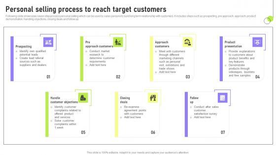 Following slide showcases seven step process personal selling which can be used by sales persons to build long term relationship with customers. It includes steps such as prospecting, pre approach, approach, product demonstration, handling objections, closing deals and follow up. Do you have to make sure that everyone on your team knows about any specific topic I yes, then you should give Personal Selling Process To Reach Target Deployment Of Marketing Communication Inspiration Pdf a try. Our experts have put a lot of knowledge and effort into creating this impeccable Personal Selling Process To Reach Target Deployment Of Marketing Communication Inspiration Pdf. You can use this template for your upcoming presentations, as the slides are perfect to represent even the tiniest detail. You can download these templates from the Slidegeeks website and these are easy to edit. So grab these today. Following slide showcases seven step process personal selling which can be used by sales persons to build long term relationship with customers. It includes steps such as prospecting, pre approach, approach, product demonstration, handling objections, closing deals and follow up.