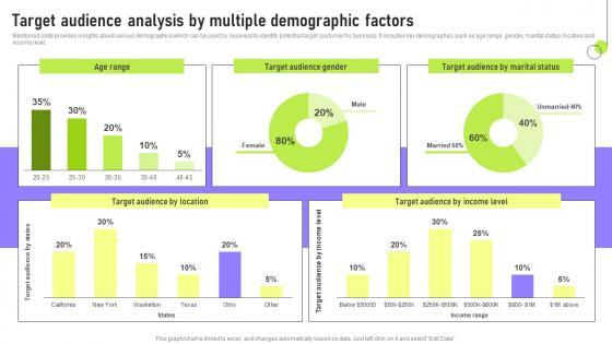 Mentioned slide provides insights about various demographics which can be used by business to identify potential target customer for business. It includes key demographics such as age range, gender, marital status, location and income level. Explore a selection of the finest Target Audience Analysis By Multiple Deployment Of Marketing Communication Inspiration Pdf here. With a plethora of professionally designed and pre made slide templates, you can quickly and easily find the right one for your upcoming presentation. You can use our Target Audience Analysis By Multiple Deployment Of Marketing Communication Inspiration Pdf to effectively convey your message to a wider audience. Slidegeeks has done a lot of research before preparing these presentation templates. The content can be personalized and the slides are highly editable. Grab templates today from Slidegeeks. Mentioned slide provides insights about various demographics which can be used by business to identify potential target customer for business. It includes key demographics such as age range, gender, marital status, location and income level.