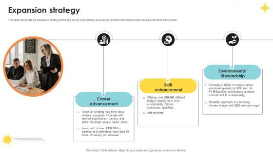 This slide represents the expansion strategy for Ernst and Young, highlighting career advancement, skill enhancement, and environmental stewardship.From laying roadmaps to briefing everything in detail, our templates are perfect for you. You can set the stage with your presentation slides. All you have to do is download these easy-to-edit and customizable templates. Expansion Strategy Professional Services And Tax Advisory Company Profile CP SS V will help you deliver an outstanding performance that everyone would remember and praise you for. Do download this presentation today. This slide represents the expansion strategy for Ernst and Young, highlighting career advancement, skill enhancement, and environmental stewardship.