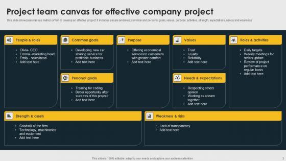 This slide showcases various metrics of firm to develop an effective project. It includes people and roles, common and personal goals, values, purpose, activities, strength, expectations, needs and weakness. Pitch your topic with ease and precision using this Project Team Canvas For Effective Company Project Information Pdf. This layout presents information on Common Goals, Personal Goals, Purpose. It is also available for immediate download and adjustment. So, changes can be made in the color, design, graphics or any other component to create a unique layout. This slide showcases various metrics of firm to develop an effective project. It includes people and roles, common and personal goals, values, purpose, activities, strength, expectations, needs and weakness.