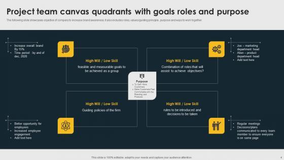 The following slide showcases objective of company to increase brand awareness. It also includes roles, valuesguiding principle , purpose and ways to work together. Showcasing this set of slides titled Project Team Canvas Quadrants With Goals Roles And Purpose Diagrams Pdf. The topics addressed in these templates are High Will, Low Skill. All the content presented in this PPT design is completely editable. Download it and make adjustments in color, background, font etc. as per your unique business setting. The following slide showcases objective of company to increase brand awareness. It also includes roles, valuesguiding principle , purpose and ways to work together.