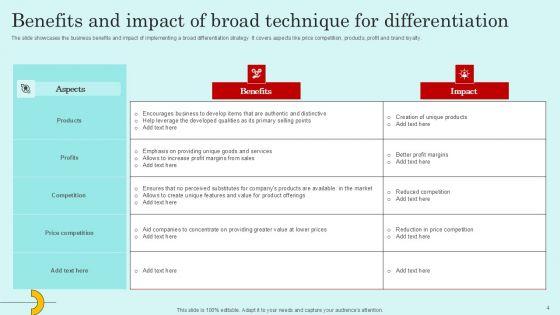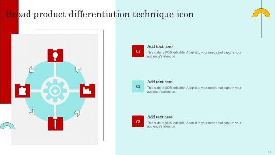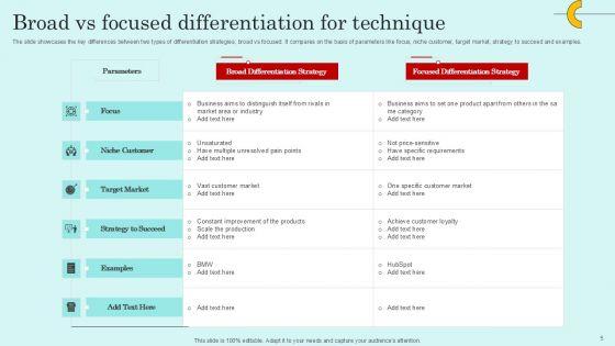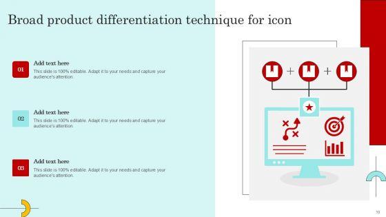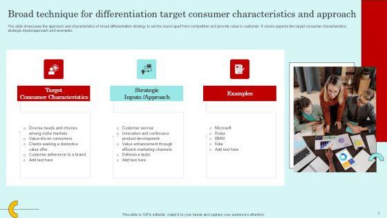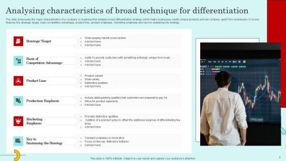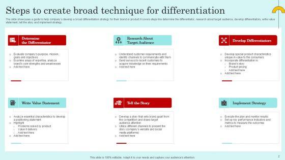If designing a presentation takes a lot of your time and resources and you are looking for a better alternative, then this Broad Technique For Differentiation Ppt PowerPoint Presentation Complete Deck With Slides is the right fit for you. This is a prefabricated set that can help you deliver a great presentation on the topic. All the twelve slides included in this sample template can be used to present a birds-eye view of the topic. These slides are also fully editable, giving you enough freedom to add specific details to make this layout more suited to your business setting. Apart from the content, all other elements like color, design, theme are also replaceable and editable. This helps in designing a variety of presentations with a single layout. Not only this, you can use this PPT design in formats like PDF, PNG, and JPG once downloaded. Therefore, without any further ado, download and utilize this sample presentation as per your liking.