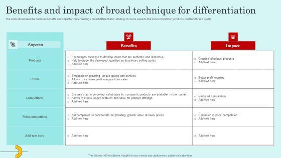 The slide showcases the business benefits and impact of implementing a broad differentiation strategy It covers aspects like price competition, products, profit and brand loyalty. Showcasing this set of slides titled Benefits And Impact Of Broad Technique For Differentiation Infographics PDF. The topics addressed in these templates are Profits, Products, Competition. All the content presented in this PPT design is completely editable. Download it and make adjustments in color, background, font etc. as per your unique business setting.