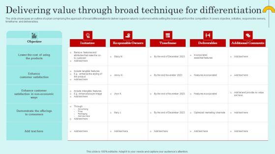 The slide showcases an outline of a plan comprising the approach of broad differentiation to deliver superior value to customers while setting the brand apart from the competition. It covers objective, initiative, responsible owners, timeframe and deliverables. Showcasing this set of slides titled Delivering Value Through Broad Technique For Differentiation Guidelines PDF. The topics addressed in these templates are Deliverables, Responsible Owners, Timeframe. All the content presented in this PPT design is completely editable. Download it and make adjustments in color, background, font etc. as per your unique business setting.