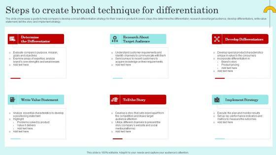 The slide showcases a guide to help companys develop a broad differentiation strategy for their brand or product.it covers steps like determine the differentiator, research about target audience, develop differentiators, write value statement, tell the story and implement strategy. Presenting Steps To Create Broad Technique For Differentiation Mockup PDF to dispense important information. This template comprises six stages. It also presents valuable insights into the topics including Determine Differentiator, Research Target Audience, Develop Differentiators. This is a completely customizable PowerPoint theme that can be put to use immediately. So, download it and address the topic impactfully.