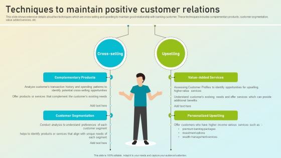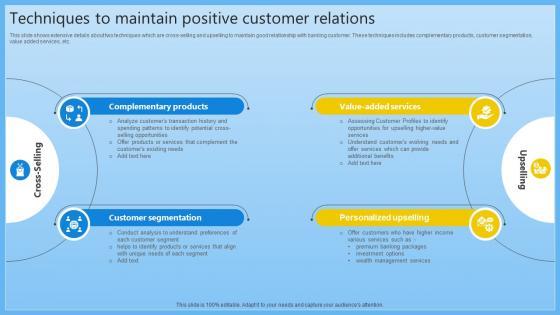 This slide shows extensive details about two techniques which are cross-selling and upselling to maintain good relationship with banking customer. These techniques includes complementary products, customer segmentation, value added services, etc. The Beginners Guide To Commercial Techniques To Maintain Positive Customer Relations Fin SS V is a compilation of the most recent design trends as a series of slides. It is suitable for any subject or industry presentation, containing attractive visuals and photo spots for businesses to clearly express their messages. This template contains a variety of slides for the user to input data, such as structures to contrast two elements, bullet points, and slides for written information. Slidegeeks is prepared to create an impression. This slide shows extensive details about two techniques which are cross-selling and upselling to maintain good relationship with banking customer. These techniques includes complementary products, customer segmentation, value added services, etc.