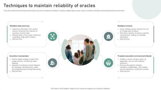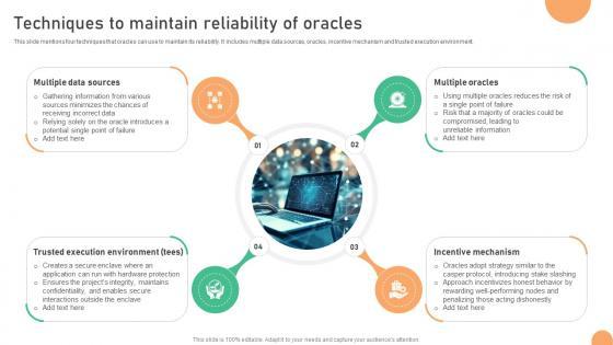 This slide mentions four techniques that oracles can use to maintain its reliability. It includes multiple data sources, oracles, incentive mechanism and trusted execution environment. Do you have to make sure that everyone on your team knows about any specific topic I yes, then you should give Seamless Integration The Power Techniques To Maintain Reliability Of Oracles BCT SS V a try. Our experts have put a lot of knowledge and effort into creating this impeccable Seamless Integration The Power Techniques To Maintain Reliability Of Oracles BCT SS V. You can use this template for your upcoming presentations, as the slides are perfect to represent even the tiniest detail. You can download these templates from the Slidegeeks website and these are easy to edit. So grab these today This slide mentions four techniques that oracles can use to maintain its reliability. It includes multiple data sources, oracles, incentive mechanism and trusted execution environment.