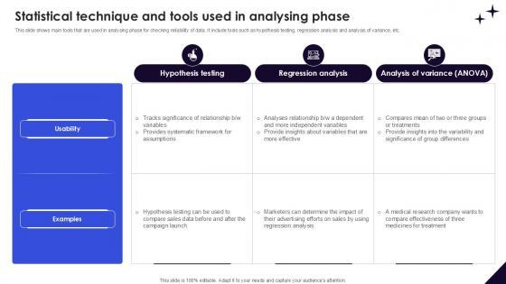 This slide shows main tools that are used in analysing phase for checking reliability of data. It include tools such as hypothesis testing, regression analysis and analysis of variance, etc. Here you can discover an assortment of the finest PowerPoint and Google Slides templates. With these templates, you can create presentations for a variety of purposes while simultaneously providing your audience with an eye-catching visual experience. Download Statistical Technique And Tools DMAIC Methodology To Maintain PPT PowerPoint to deliver an impeccable presentation. These templates will make your job of preparing presentations much quicker, yet still, maintain a high level of quality. Slidegeeks has experienced researchers who prepare these templates and write high-quality content for you. Later on, you can personalize the content by editing the Statistical Technique And Tools DMAIC Methodology To Maintain PPT PowerPoint. This slide shows main tools that are used in analysing phase for checking reliability of data. It include tools such as hypothesis testing, regression analysis and analysis of variance, etc.
