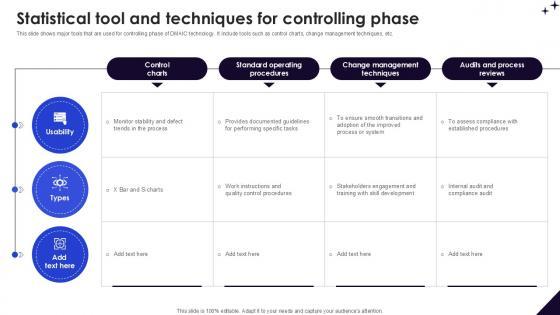 This slide shows major tools that are used for controlling phase of DMAIC technology. It include tools such as control charts, change management techniques, etc. This Statistical Tool And Techniques DMAIC Methodology To Maintain PPT PowerPoint from Slidegeeks makes it easy to present information on your topic with precision. It provides customization options, so you can make changes to the colors, design, graphics, or any other component to create a unique layout. It is also available for immediate download, so you can begin using it right away. Slidegeeks has done good research to ensure that you have everything you need to make your presentation stand out. Make a name out there for a brilliant performance. This slide shows major tools that are used for controlling phase of DMAIC technology. It include tools such as control charts, change management techniques, etc.