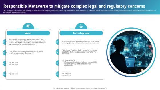 This slide provides information regarding role of metaverse in mitigating complex legal and regulatory issues. It ensures privacy, safety and ethical requirements while working on metaverse. AI is deployed with Metaverse to ensure responsible working over platform. Find highly impressive Responsible Metaverse To Mitigate Complex Legal Continuum Of Technology Revamping Business AI SS V on Slidegeeks to deliver a meaningful presentation. You can save an ample amount of time using these presentation templates. No need to worry to prepare everything from scratch because Slidegeeks experts have already done a huge research and work for you. You need to download Responsible Metaverse To Mitigate Complex Legal Continuum Of Technology Revamping Business AI SS V for your upcoming presentation. All the presentation templates are 100 percent editable and you can change the color and personalize the content accordingly. Download now This slide provides information regarding role of metaverse in mitigating complex legal and regulatory issues. It ensures privacy, safety and ethical requirements while working on metaverse. AI is deployed with Metaverse to ensure responsible working over platform.