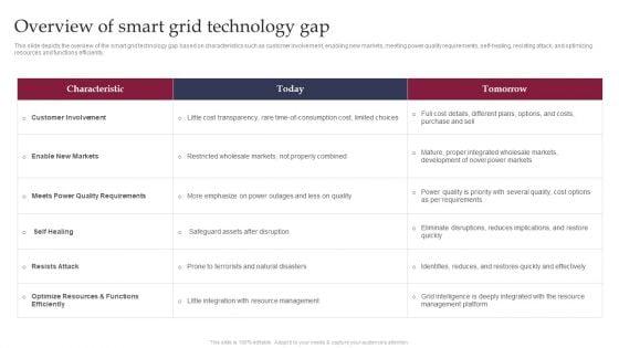 This slide depicts the overview of the smart grid technology gap based on characteristics such as customer involvement, enabling new markets, meeting power quality requirements, self-healing, resisting attack, and optimizing resources and functions efficiently. Do you have to make sure that everyone on your team knows about any specific topic I yes, then you should give Smart Grid Technology Overview Of Smart Grid Technology Gap Slides PDF a try. Our experts have put a lot of knowledge and effort into creating this impeccable Smart Grid Technology Overview Of Smart Grid Technology Gap Slides PDF. You can use this template for your upcoming presentations, as the slides are perfect to represent even the tiniest detail. You can download these templates from the Slidegeeks website and these are easy to edit. So grab these today.