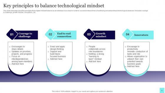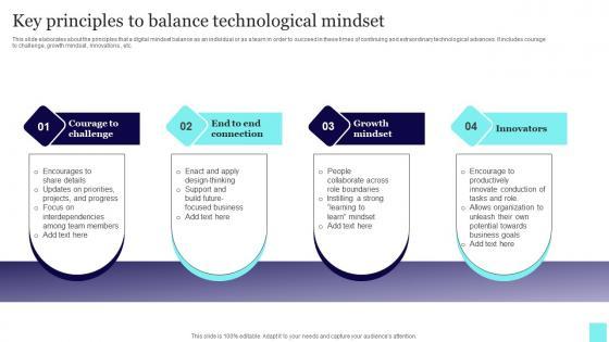 This slide elaborates about the principles that a digital mindset balance as an individual or as a team in order to succeed in these times of continuing and extraordinary technological advances. It includes courage to challenge, growth mindset, innovations, etc. Pitch your topic with ease and precision using this Key Principles To Balance Technological Mindset Graphics Pdf. This layout presents information on Growth Mindset, Innovations. It is also available for immediate download and adjustment. So, changes can be made in the color, design, graphics or any other component to create a unique layout. This slide elaborates about the principles that a digital mindset balance as an individual or as a team in order to succeed in these times of continuing and extraordinary technological advances. It includes courage to challenge, growth mindset, innovations, etc.