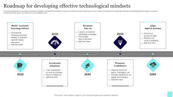 This slide displays the roadmap for developing a digital mindset that will help the employees and the business itself to get success in this increasingly dominated data-intensive and intelligent technologies. It includes building learning culture, promote buy-in and confidence, etc. Showcasing this set of slides titled Roadmap For Developing Effective Technological Mindsets Microsoft Pdf. The topics addressed in these templates are Align Digital Systems, Promote Confidence, Accelerate Adoption. All the content presented in this PPT design is completely editable. Download it and make adjustments in color, background, font etc. as per your unique business setting. This slide displays the roadmap for developing a digital mindset that will help the employees and the business itself to get success in this increasingly dominated data-intensive and intelligent technologies. It includes building learning culture, promote buy-in and confidence, etc.