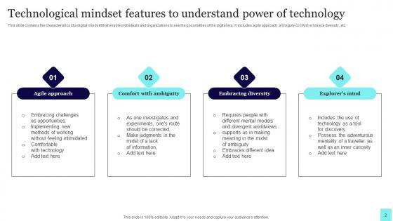 This slide contains the characteristics of a digital mindset that enable individuals and organizations to see the possibilities of the digital era. It includes agile approach, ambiguity comfort, embrace diversity, etc. Pitch your topic with ease and precision using this Technological Mindset Features To Understand Power Of Technology Background Pdf. This layout presents information on Agile Approach, Ambiguity Comfort, Embrace Diversity. It is also available for immediate download and adjustment. So, changes can be made in the color, design, graphics or any other component to create a unique layout. This slide contains the characteristics of a digital mindset that enable individuals and organizations to see the possibilities of the digital era. It includes agile approach, ambiguity comfort, embrace diversity, etc.