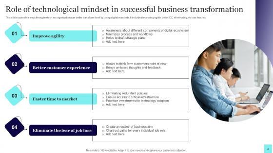 This slide covers the ways through which an organization can better transform itself by using digital mindsets. It includes improving agility, better CX, eliminating job loss fear, etc. Pitch your topic with ease and precision using this Role Of Technological Mindset In Successful Business Transformation Introduction Pdf. This layout presents information on Improve Agility, Better Customer Experience, Eliminate Fear, Job Loss. It is also available for immediate download and adjustment. So, changes can be made in the color, design, graphics or any other component to create a unique layout. This slide covers the ways through which an organization can better transform itself by using digital mindsets. It includes improving agility, better CX, eliminating job loss fear, etc.