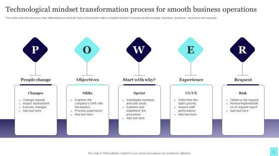 This slide covers the process in five different phases that will help in the transformation of digital mindset. It includes people changes, objectives, questions , experience and requests. Pitch your topic with ease and precision using this Technological Mindset Transformation Process For Smooth Business Operations Mockup Pdf. This layout presents information on People Change, Objectives, Experience. It is also available for immediate download and adjustment. So, changes can be made in the color, design, graphics or any other component to create a unique layout. This slide covers the process in five different phases that will help in the transformation of digital mindset. It includes people changes, objectives, questions , experience and requests.