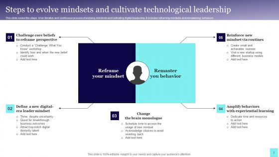 This slide covers the steps of an iterative and continuous process of evolving mindsets and cultivating digital leadership. It includes reframing mindsets and remastering behaviors. Showcasing this set of slides titled Steps To Evolve Mindsets And Cultivate Technological Leadership Mockup Pdf. The topics addressed in these templates are Reframe Your Mindset, Remaster You Behavior, Change Brain Monologue. All the content presented in this PPT design is completely editable. Download it and make adjustments in color, background, font etc. as per your unique business setting. This slide covers the steps of an iterative and continuous process of evolving mindsets and cultivating digital leadership. It includes reframing mindsets and remastering behaviors.