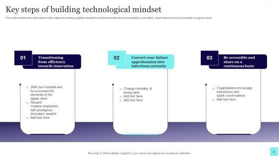 This slide contains the information on the steps for building a digital mindset. It includes transition from productivity to innovation, covert failure and be accessible on regular basis. Showcasing this set of slides titled Key Steps Of Building Technological Mindset Portrait Pdf. The topics addressed in these templates are Transitioning From Efficiency, Towards Innovation, Infectious Curiosity. All the content presented in this PPT design is completely editable. Download it and make adjustments in color, background, font etc. as per your unique business setting. This slide contains the information on the steps for building a digital mindset. It includes transition from productivity to innovation, covert failure and be accessible on regular basis.