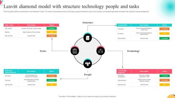 Following slide outlines comprehensive Leavitt diamond model. The model incorporates structure, technology, people and tasks through which company can assess organization strengths with respect to change management. Pitch your topic with ease and precision using this Leavitt Diamond Model With Structure Technology People And Tasks Formats PDF. This layout presents information on Structure, Tasks, People. It is also available for immediate download and adjustment. So, changes can be made in the color, design, graphics or any other component to create a unique layout.