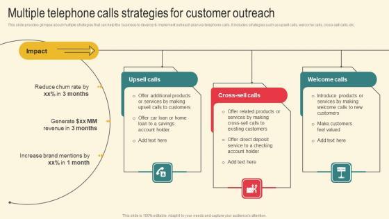 This slide provides glimpse about multiple strategies that can help the business to develop and implement outreach plan via telephone calls. It includes strategies such as upsell calls, welcome calls, cross-sell calls, etc. There are so many reasons you need a Multiple Telephone Calls Strategies Planning Outreach Campaigns PPT Example. The first reason is you can not spend time making everything from scratch, Thus, Slidegeeks has made presentation templates for you too. You can easily download these templates from our website easily. This slide provides glimpse about multiple strategies that can help the business to develop and implement outreach plan via telephone calls. It includes strategies such as upsell calls, welcome calls, cross-sell calls, etc.