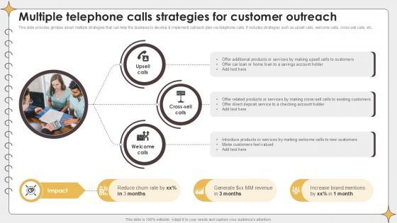 This slide provides glimpse about multiple strategies that can help the business to develop and implement outreach plan via telephone calls. It includes strategies such as upsell calls, welcome calls, cross sell calls, etc. The Multiple Telephone Calls Strategies Marketing Plan For Boosting Client Retention In Retail Banking Topics Pdf is a compilation of the most recent design trends as a series of slides. It is suitable for any subject or industry presentation, containing attractive visuals and photo spots for businesses to clearly express their messages. This template contains a variety of slides for the user to input data, such as structures to contrast two elements, bullet points, and slides for written information. Slidegeeks is prepared to create an impression. This slide provides glimpse about multiple strategies that can help the business to develop and implement outreach plan via telephone calls. It includes strategies such as upsell calls, welcome calls, cross sell calls, etc.