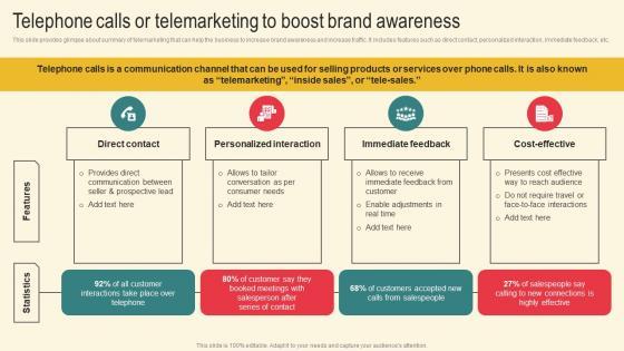 This slide provides glimpse about summary of telemarketing that can help the business to increase brand awareness and increase traffic. It includes features such as direct contact, personalized interaction, immediate feedback, etc. The best PPT templates are a great way to save time, energy, and resources. Slidegeeks have 100 percent editable powerpoint slides making them incredibly versatile. With these quality presentation templates, you can create a captivating and memorable presentation by combining visually appealing slides and effectively communicating your message. Download Telephone Calls Or Telemarketing To Planning Outreach Campaigns PPT Template from Slidegeeks and deliver a wonderful presentation. This slide provides glimpse about summary of telemarketing that can help the business to increase brand awareness and increase traffic. It includes features such as direct contact, personalized interaction, immediate feedback, etc.