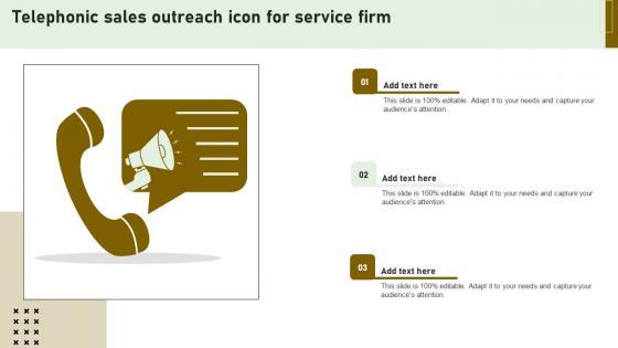 Showcasing this set of slides titled Telephonic Sales Outreach Icon For Service Firm Ideas Pdf. The topics addressed in these templates are Telephonic Sales Outreach, Icon For Service Firm. All the content presented in this PPT design is completely editable. Download it and make adjustments in color, background, font etc. as per your unique business setting. Our Telephonic Sales Outreach Icon For Service Firm Ideas Pdf are topically designed to provide an attractive backdrop to any subject. Use them to look like a presentation pro.