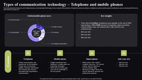This slide depicts the telephone and mobile phones as communication technology. It also consists of the evolution of telephone service to wireless smartphone systems and the global mobile phone users, including North America, Latin America, Europe, etc. Present like a pro with Types Of Communication Technology Telephone And Mobile Phones Structure Pdf Create beautiful presentations together with your team, using our easy to use presentation slides. Share your ideas in real time and make changes on the fly by downloading our templates. So whether you are in the office, on the go, or in a remote location, you can stay in sync with your team and present your ideas with confidence. With Slidegeeks presentation got a whole lot easier. Grab these presentations today. This slide depicts the telephone and mobile phones as communication technology. It also consists of the evolution of telephone service to wireless smartphone systems and the global mobile phone users, including North America, Latin America, Europe, etc.