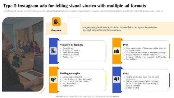 This slide provides glimpse about using Instagram ads for paid marketing that help the businesses to easily advertise their product to masses. It includes description, available ad formats, bidding strategies, pros, cons, etc. Slidegeeks is here to make your presentations a breeze with Type 2 Instagram Ads For Telling Visual Stories With Multiple Ad Formats Brochure PDF With our easy to use and customizable templates, you can focus on delivering your ideas rather than worrying about formatting. With a variety of designs to choose from, you are sure to find one that suits your needs. And with animations and unique photos, illustrations, and fonts, you can make your presentation pop. So whether you are giving a sales pitch or presenting to the board, make sure to check out Slidegeeks first.