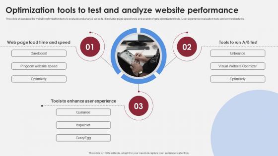 This slide showcases the website optimization tools to evaluate and analyze website. It includes page speed tools and search engine optimization tools, User experience evaluation tools and conversion tools. Here you can discover an assortment of the finest PowerPoint and Google Slides templates. With these templates, you can create presentations for a variety of purposes while simultaneously providing your audience with an eye-catching visual experience. Download Optimization Tools To Test And Analyze Accelerating Market Share And Profitability MKT SS V to deliver an impeccable presentation. These templates will make your job of preparing presentations much quicker, yet still, maintain a high level of quality. Slidegeeks has experienced researchers who prepare these templates and write high-quality content for you. Later on, you can personalize the content by editing the Optimization Tools To Test And Analyze Accelerating Market Share And Profitability MKT SS V. This slide showcases the website optimization tools to evaluate and analyze website. It includes page speed tools and search engine optimization tools, User experience evaluation tools and conversion tools.