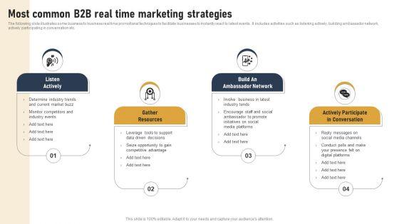 The following slide illustrates some business to business real time promotional techniques to facilitate businesses to instantly react to latest events. It includes activities such as listening actively, building ambassador network, actively participating in conversation etc. Coming up with a presentation necessitates that the majority of the effort goes into the content and the message you intend to convey. The visuals of a PowerPoint presentation can only be effective if it supplements and supports the story that is being told. Keeping this in mind our experts created Incorporating Real Time Marketing For Improved Consumer Most Common B2b Real Time Marketing Topics PDF to reduce the time that goes into designing the presentation. This way, you can concentrate on the message while our designers take care of providing you with the right template for the situation.