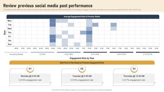 The following slide depicts social media post performance analysis to determine best publishing time and manage campaigns. It includes elements such as average engagement rate by days and time etc. Do you have an important presentation coming up Are you looking for something that will make your presentation stand out from the rest Look no further than Incorporating Real Time Marketing For Improved Consumer Review Previous Social Media Post Performance Topics PDF. With our professional designs, you can trust that your presentation will pop and make delivering it a smooth process. And with Slidegeeks, you can trust that your presentation will be unique and memorable. So why wait Grab Incorporating Real Time Marketing For Improved Consumer Review Previous Social Media Post Performance Topics PDF today and make your presentation stand out from the rest.
