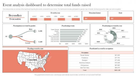 This slide provides an overview of the dashboard depicting the events conducted to raise money. The dashboard includes participation by gender, type of events, fundraising event by state, year and occupation.This Event Analysis Dashboard To Determine Total Funds Raised Efficient Nonprofit Marketing Clipart Pdf is perfect for any presentation, be it in front of clients or colleagues. It is a versatile and stylish solution for organizing your meetings. The Event Analysis Dashboard To Determine Total Funds Raised Efficient Nonprofit Marketing Clipart Pdf features a modern design for your presentation meetings. The adjustable and customizable slides provide unlimited possibilities for acing up your presentation. Slidegeeks has done all the homework before launching the product for you. So, do not wait, grab the presentation templates today This slide provides an overview of the dashboard depicting the events conducted to raise money. The dashboard includes participation by gender, type of events, fundraising event by state, year and occupation.